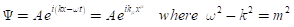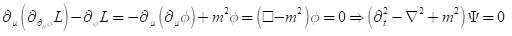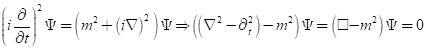 와 같은 klein-gordon 방정식이 유도된다. 상대론적인 슈뢰딩거방정식이다. 위에서 사각형박스는 D'Alembert (라플라스이 스승) 방정식이라고 부르고 만약 시간에 대한 미분이 없다면 Laplacian 연산자이다. 위 방정식와 아래 모든 방정식의 전개에서 흔히 물리학 책에서 가정하듯이 h-bar=c=1로 둔다.