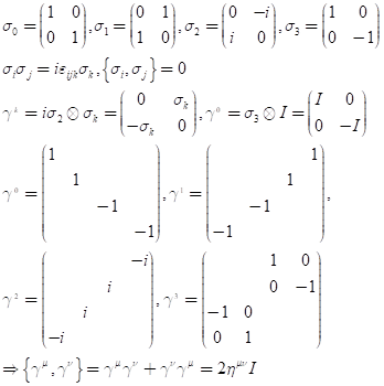 디락 행렬 혹은 gamma matrix는 4x4 행렬이고 그것들은 Clifford algebra를 만족시키는 행렬들이다. Clifford algebra에 대해서는 나중에 상세히 설명하기로 하고, 그 대수적인 구조를 먼저 간단히 기술해 보자. 아래 수식에서 보듯이 gamma matrix는 Pauli 행렬로부터 정의된다.