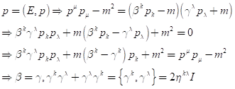 위 방정식에서 b와 g은 왜 필요한가? 왜냐하면 그것이 없으면 절대 위의 관계를 만족시킬 수 없기 때문이다 (즉 인수분해가 안되기 때문이다). 그리고, 그 값이 scalar 값, 즉 어떤 실수값인 경우도 절대로 위의 형태로 인수분해가 안되고, 그것이 인수분해가 되려면 그 두 값은 행렬 형태로 주어져야 하며 특정한 수학적 구조를 만족해야 한다. 이렇나 수학적 구조, 즉, {.,.}연산을 가진 대수 구조체를 Clifford algebra라고 부른다.