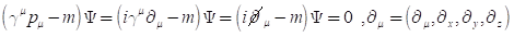 이제 KG방정식은 인수분해된 한 쪽 pair인 다음 방정식을 만족해야 한다. 다음 방정식이 그 유명한 Dirac 방정식이며, 양자역학/양자장론/게이지 이론을 이해하려면 반드시 만나게 되는 방정식이다. 기호가 마치 삭제 표시와 비슷한 요상하게 생긴 방정식이다. K-G 방정식이 2차 미분 방정식인데 비해, Dirac 방정식은 1차 미분 방정식인데, 행렬 방정식이다.