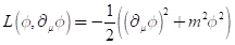 조금 더 formal하게 유도하자면 양자장론으로 다음과 같이 유도할 수 있다. Phi(x) 혹은 phi(x,y,z)를 양자장, quantum field라고 하자. 양자장은, 3차원 공간의 한점마다 한 개의 자유도를 가지는 입자의 장이라고 생각하면 된다. 양자장이 vacuum state에 있으면 입자가 없고, 아니면 입자는 관측된다. 양자장이 Lorentz변환에 대해서, 즉 4차원 시공간의 회전 변환에 대해서 불변이 되기 위해서는 Lagrangian이 아래와 같이 제곱항으로 주어져야 한다. 이것이 유일하지는 않지만, 보통 양자장론에서 말하는 free particle의 움직임을 기술하는 라그랑지안이다.