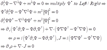 문제도 유도했고, 상대성 원리에도 맞고 … 다 좋은 것 같은데 klein-gordon 방정식은 치명적인 문제점을 안고 있다. 먼저, K-G 방정식으로부터 probability density 와 probability current를 다음과 같이 유도해 보자. 연속 방정식과 완벽하게 동일한 형식이다.