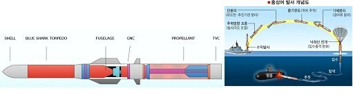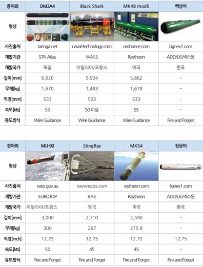 어뢰는 크게는 크기/추적거리/파괴력이 약한 경어뢰(324mm)와 상대적으로 큰 중어뢰(533mm)로 대별된다. 경어뢰는 목표물 인근에 투척되어 짧은 거리를 추적 가능하고, 중어뢰는 30km 이상 장거리에서 발사되어 목표물을 추적, 파괴한다. 한국의 어뢰명은 상어로 붙여지는데, “청상어”는 함정/대잠헬기/초계기에서 발사되는 경어뢰이며 당연히 무선유도되며 발사후 망각 형태로 운영된다. “홍상어”는 청상어에 로켓을 붙여 원거리 이동 후, 낙하선을 펼쳐서 조심스럽게 입수후 추적하는 형태의 어뢰이다. 백상어/범상어는 중어뢰이다.