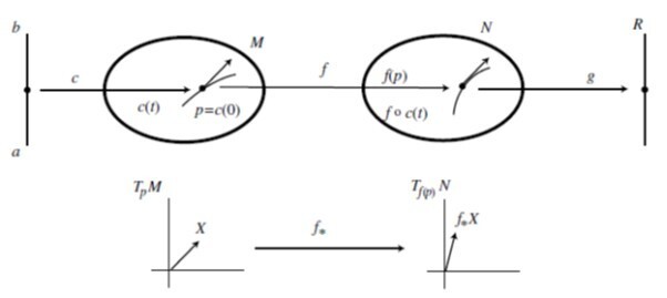 두 다양체 M,N간에 Smooth(differentiable) map f:M→N 이 주어지면 자연스럽게 tangent plane사이에서도 변환관계 f_*:TpM→Tf(p)M 가 존재하며 이를 induced map이라고 한다. 아래 그림에서 다양체 M에서 정의된 TpM에 존재하는 X라는 벡터를 induced map에 의해서 다양체 N상에 정의된 Tf(p)M에 존재하는 Y=f_*X로 옮길 때, Y가 X의 pushforward라고 부른다. 만약 f: M→N, g: N→K 라면, (g o f)_*=g_* o f_* 로 됨을 쉽게 확인할 수 있다. 사실, 미분 기하학을 전혀 공부하지 않은 상태에서 이 부분을 읽으면 암호처럼 느껴질 수 있다.