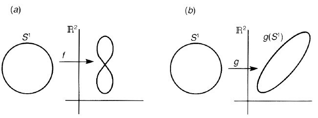f:M→N 에서 dim(M)<=dim(N)인 경우, pushforward map f_*: TpM→Tf(p)M 이 injective map이면 (1:1) rank f_* = dim M 이고 f를 immersion of M into N이라고 부른다. 만약 f와 f_* 모두 injective 이면 f를 embedding 이라고 부르고, f(M)을 submanifold of N이라고 부른다. 아래에서 f,g :S1→R^2 인데, (b)의 경우는 S1의 한점에 g(S1)위의 한점씩 1대 1로 mapping되기에 embedding이지만, (a)의 경우는 두원의 교차점에 해당하는 점이 2개의 점에 mapping되기에 immersion 이지, embedding은 아니다.