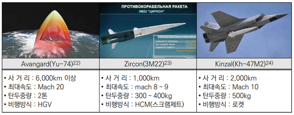 러시아의 주력 극초음속 미사일은 크게 3종류이다. 지르콘, 킨잘, 아방가르드가 그들이다. 최초로 나온 것은 2010년 개발된 지르콘으로, 사거리 250~1000km, 마하 8~9, 탄두 중량 3~400kg에 스크램제트엔진을 장착한 대함, 대지 HCM 순항 미사일이다. 마하 8로 저공으로 빠르게 이동하는 순항미사일이기에 이지스 체계로 탐지와 요격이 쉽지 않다.