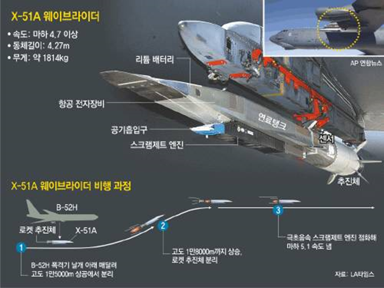 한국은 12월 하이코어(Hycore)라는 극초음속 시험발사체를 완성하고 2023년까지 시험비행을 마칠 계획을 가지고 있다. 길이 8.7미터 무게 2.4t으로 극초음속 미사일 개발을 위한 프로토타입 발사체이다. 북한 극초음속 미사일은 HGV 방식이라, 궤도 수정에 한계가 있는데 한국은 HCM 방식으로 개발 중이라, 좀 더 난이도가 높은 미사일을 개발 중이다. 이를 위한 핵심 기술인 스크램제트 엔진은 이미 개발을 완료한 상태이다. 스크램제트 엔진은 공기 흡입구 앞에 발생하는 V자 모양의 충격파에 의해 압축된 고온(1700도)/고압의 공기에 탄화수소나 수소 같은 연료를 분사하여 강력한 추진력을 얻는 엔진이다.
