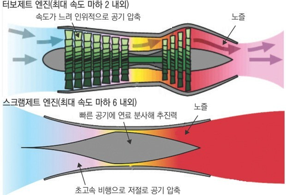 램제트는 충격파에 의해서 압축된 공기가 음속보다 낮아지며, 연소실에서 연료와 혼합된다. 램제트 엔진은 마하 2 이상에서 좋은 효율을 보이지만, 마하 5를 넘어가는 극 초음속에서는 충격파에 의해 압축된 공기의 속력을 낮추기 어렵기에 성능이 크게 떨어진다. 스크램제트는 내부의 공기 속도가 초음속의 상태를 유지하는데, 램제트보다 고속인 최대 마하 15를 낼 수 있는 것으로 알려져 있다. 스크램제트는 연소실로 들어오는 공기의 흐름이 초음속인 엔진을 지칭한다.